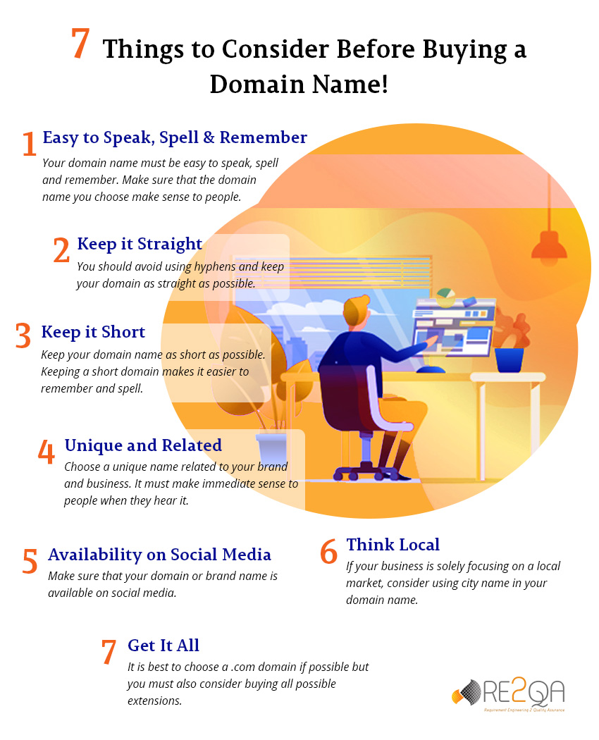 Thinking about starting a new online business or taking your existing business online, choosing the right domain is always a tricky task. A right decision at the right time can save a lot of time and money while a poor choice can cost a lot in the long run. Here in this article RE2QA is making it easy for you to take the right decision. Following are the 7 things to consider before buying a domain for your business. These 7 things will help you avoid making mistake that may cost you down the road.